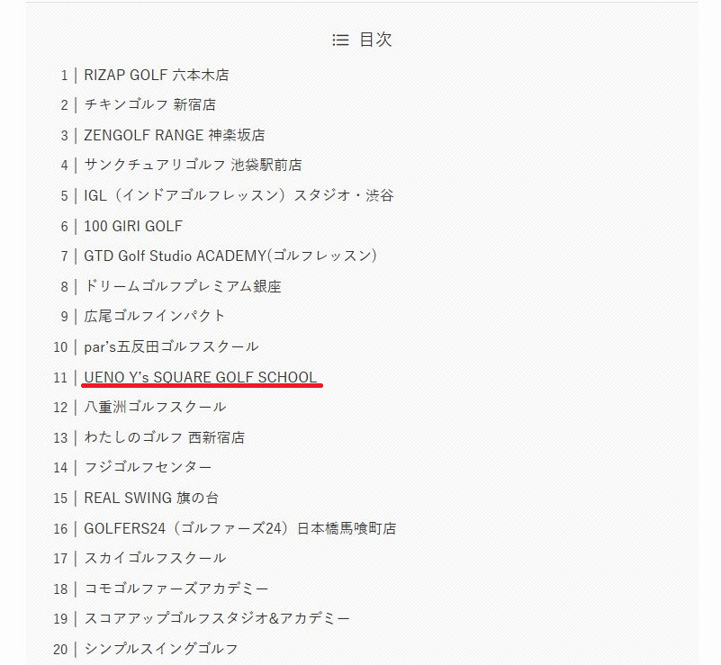 以下では、東京都で人気のゴルフスクールおすすめ20選を紹介!レッスンの特徴や内容、料金などを比較しながら、自分に合ったゴルフスクール探しの参考にしてください。